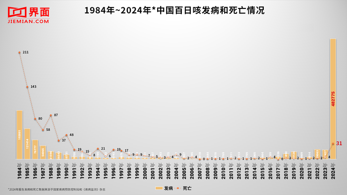 其中,百日咳发病数呈逐年走高趋势。界面新闻根据国家疾控局全国法定传染病疫情概况和《疾病检测》中国甲乙丙类传染病疫情动态统计的数据显示,2024年全年,百日咳累计发病数为482775人。这一年,百日咳发病数的增长率高达1189.9%,远高于过去4年的任何增长率。