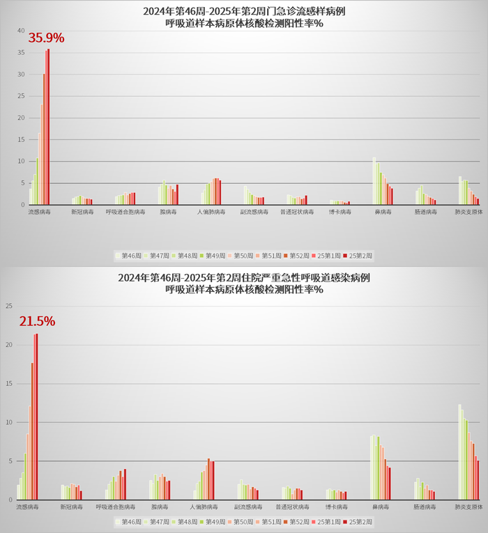 流行性感冒(下简称:流感)则在近期达到感染高峰。据界面新闻从行业内人士获悉的数据,2024年第46周至2025年第2周,门诊急诊流感样病例和住院严重急性呼吸道感染病例的样本病原核酸检测显示,流感病毒的阳性率分别达到35.9%和21.5%,远超其他病毒。